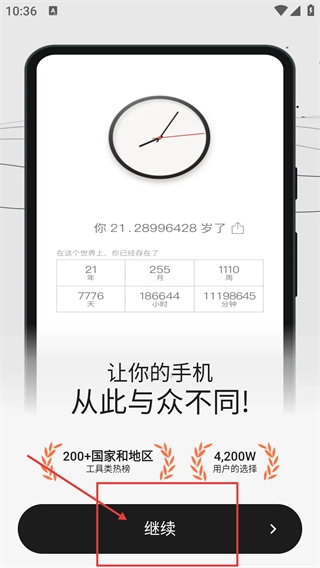 1、在显示存活时长数据的界面,点击【继续】按钮,就能进入软件功能主界面,这款软件曾登上200多个国家和地区的工具类热榜。