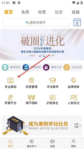 1、进入美悦学社首页后,找到并点击【专业基础】分类,即可进入该类别对应的课程列表页面。
