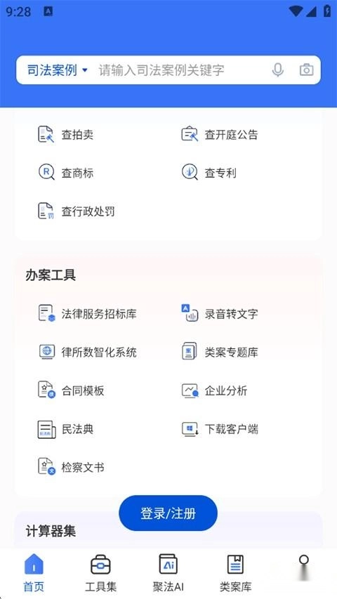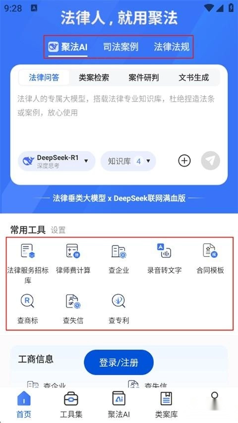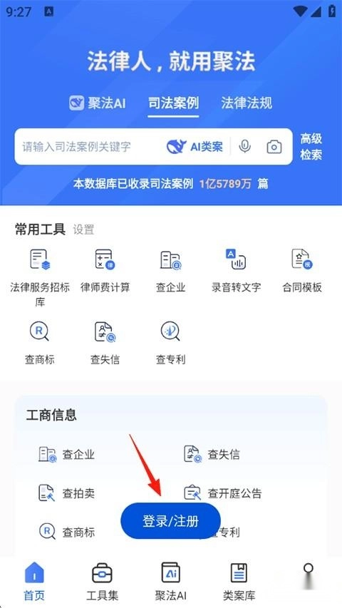4、登录账号后在上方有聚法AI、司法案例以及法律法规三个模块功能,也可以在下方的常用工具中查询各种法律问题。