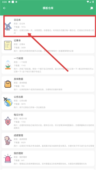 2、在模板仓库,选择【日记本】模板,其用于以时间线方式记录生活,打造私人记录空间。