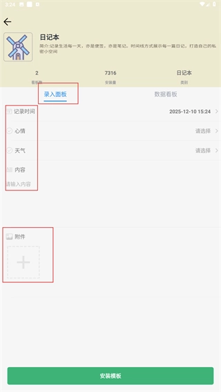3、进入【日记本】的【录入面板】,填写【记录时间】【心情】【天气】【内容】,还可添加附件,完成后安装模板。