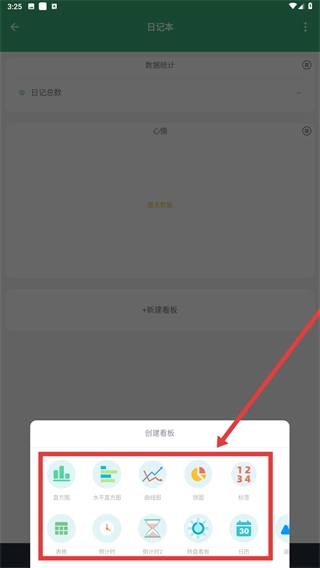 4、在【日记本】的数据看板页,点击【+新建看板】,选择【直方图】【饼图】等样式,生成日记数据的可视化看板。