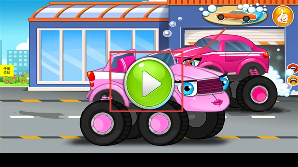 1、点击界面上的绿色开始按钮,就能进入汽车清洁游戏的操作环节,开启给卡通汽车做清洁的任务。