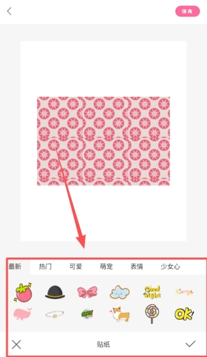 3、然后进入贴纸区在分类中找到喜欢的图案比如动物耳朵或搞怪表情轻点就能添加到画面并拖动调整位置。
