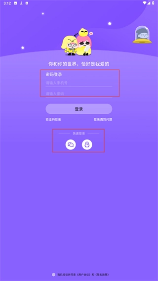 3、选择密码登录方式时,填写【请输入手机号】与【请输入密码】,或选【快速登录】的微信、QQ方式,完成账号登录。