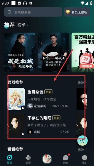 3、智能推荐系统根据用户的收听历史和偏好,自动推荐可能感兴趣的故事内容,帮助用户发现更多优质作品。