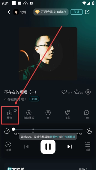 3、在播放页面点击【缓存】按钮,就能触发缓存操作的提示弹窗,准备缓存这条音频啦。