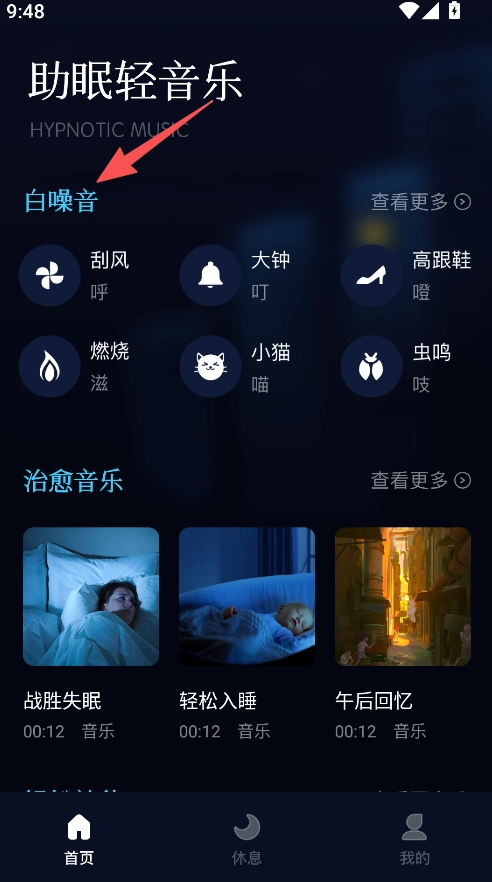 1、围绕助眠场景打造音频专区,涵盖白噪音与治愈音乐两大类别;其中白噪音板块收录自然环境音、日常场景音等多元音效,可满足不同用户的个性化助眠需求。