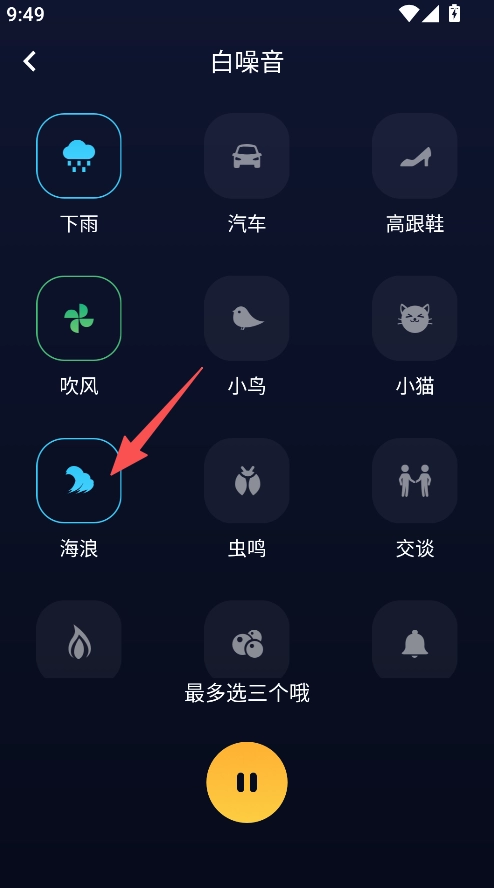 2、在白噪音页面,选择海浪等音效(最多选三个)。