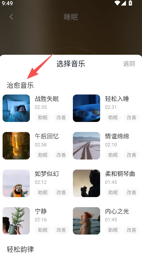 2、设有治愈音乐播放功能,进入对应板块,选择战胜失眠等曲目,播放助眠音乐内容。