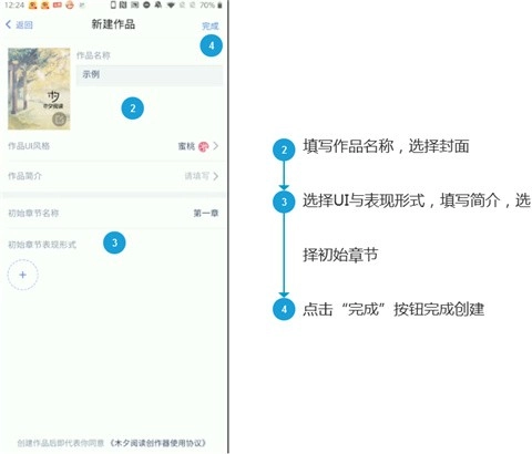3、在新建作品中填写相关信息,如作品名称、作品封面等等;填好相应的信息之后,点击“完成”