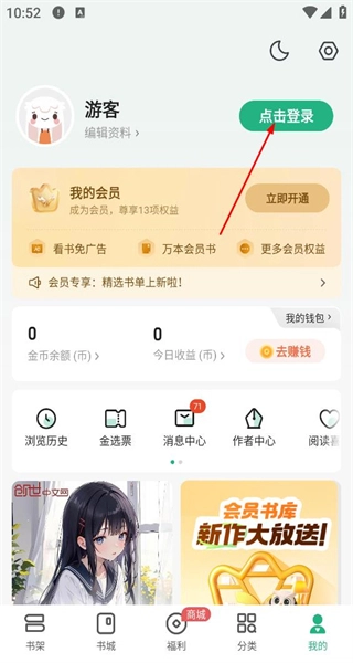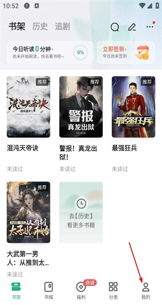 进入软件后,能在书架浏览推荐书籍,点击底部的“我的”选项,即可进入个人相关页面。