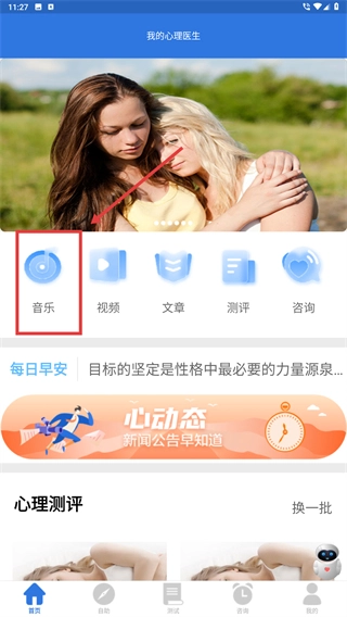 1、在【我的心理医生】首页,找到并点击【音乐】功能入口,进入心理音乐分类页面,即可获取用于情绪调节的音频资源。