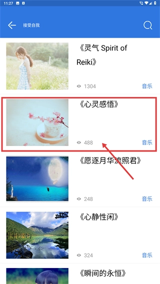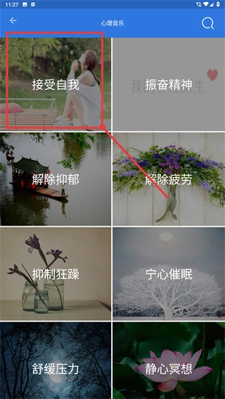 2、在心理音乐分类页,选择【接受自我】类别,进入对应主题的音乐列表,筛选适配情绪状态的音频。
