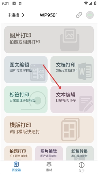 1、进入【WP9501】设备的功能界面后,找到具备“打横幅-打小字”功能的【文本编辑】选项,点击该选项即可进入对应的功能页面。