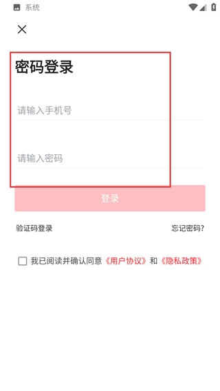 4、选择密码登录方式时,在对应界面输入【手机号】与【密码】,勾选相关协议后点击登录,完成账号登录操作。