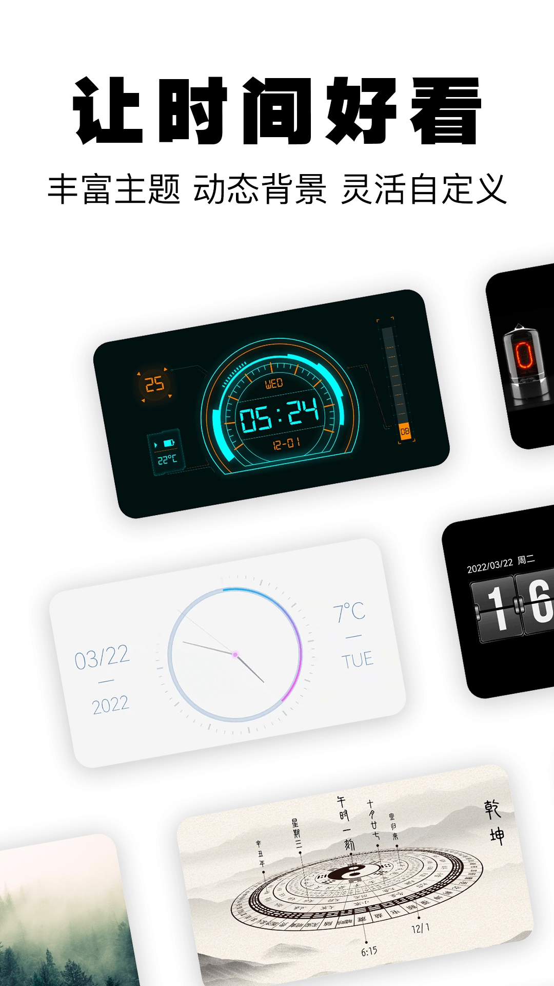 3、提供从像素风到乾坤八卦等多种创意主题,并能深度自定义背景与显示内容,让时间界面充满个性。