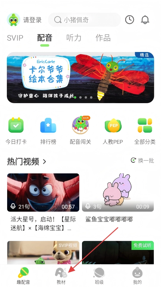 1、在应用首页,点击底部的【教材】选项,即可进入教材页面。