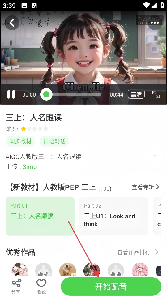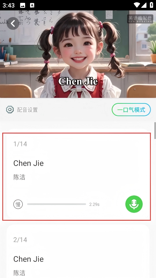 4、在配音页面,点击绿色麦克风按钮,进行配音练习,可根据提示调整语速等进行跟读。