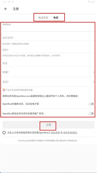 4、注册【OpenRice】需选【电话号码】或【电邮】,填写表单信息后点击【注册】按钮完成账号创建。