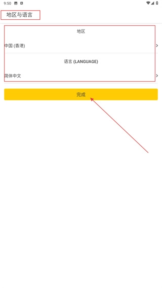 2、进入应用后先选择【地区】与【语言(LANGUAGE)】,确认设置后点击黄色【完成】按钮继续。