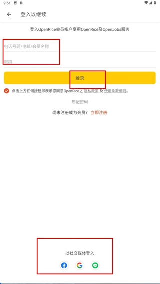 3、登录【OpenRice】可输入【电话号码-电邮-会员名称】及【密码】点击【登录】,也可选社交媒体账号登录。