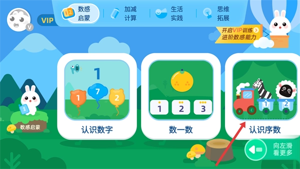 1、进入【数感启蒙】界面后,点击选择【认识序数】模块,通过卡通场景来开启序数学习,还能左滑浏览更多相关内容。