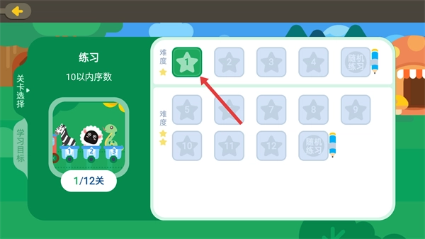 3、进入10以内序数的练习界面,选择【难度1】关卡,开启对应练习,按进度完成12关的序数学习任务。