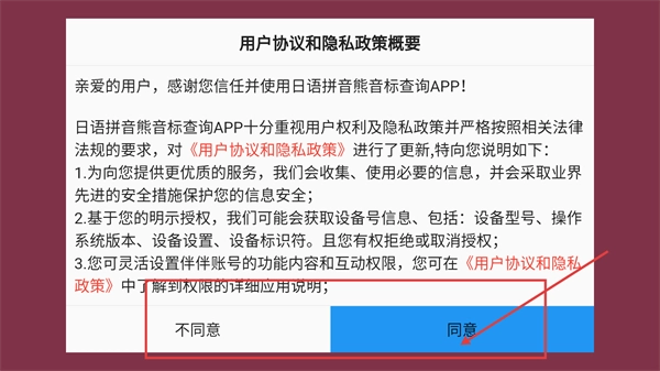 1、在进入【日语拼音音标查询】功能前,您需要先阅读【用户协议和隐私政策】的概要内容,之后点击【同意】按钮,才能进入应用使用该查询功能。