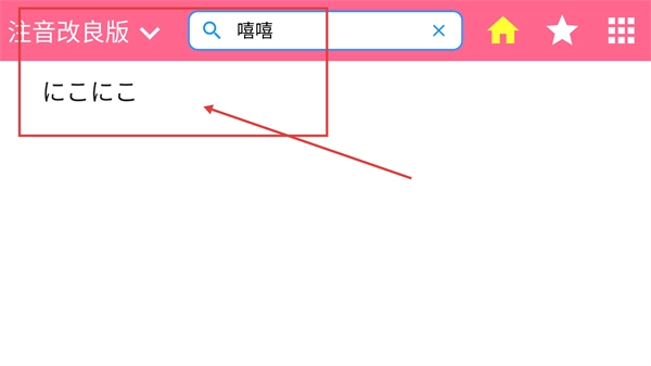 3、在搜索框输入目标单字(如【嘻嘻】),应用会自动显示对应的日文拼音音标(如【にこにこ】),完成单字注音查询。