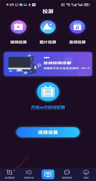 打开软件进入首页后,能看到视频投屏等功能选项,此时点击音频剪辑选项,即可进入音频选择页面。