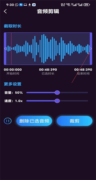 4、进入音频剪辑页面,调整截取时长等参数,点击裁剪按钮,完成音频的剪辑操作。