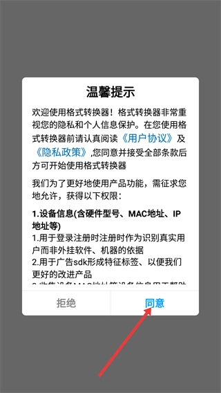 1、请先阅读【用户协议】与【隐私政策】,在了解所需获取的权限后,点击【同意】按钮,即可使用格式转换器。