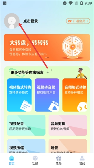 2、在首页点击头像区域的【点击登录】按钮,该页面还提供【视频格式转换-支持多种格式】等功能选项。