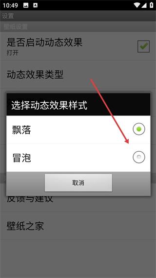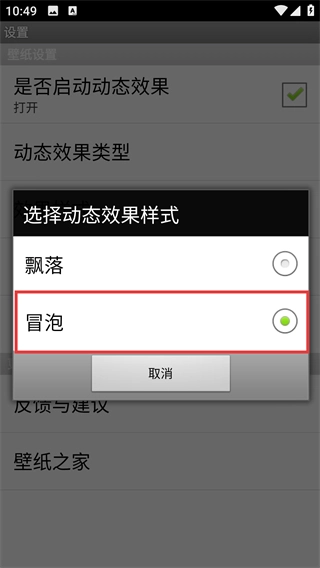 4、在效果样式菜单中,点击【冒泡】对应的单选按钮,即可将动态效果切换为冒泡样式。