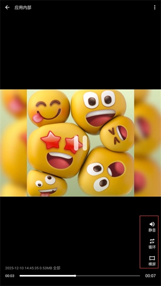 4、在视频播放页,可通过右侧功能按钮,设置【静音】【循环】【横屏】等播放参数,调整观看体验。