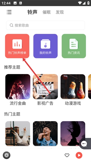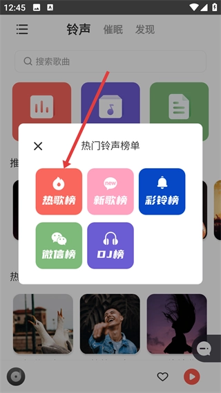 2、在展开的榜单分类界面,选择【热歌榜】选项,进入热歌类铃声的列表页面,查看热门铃声资源。