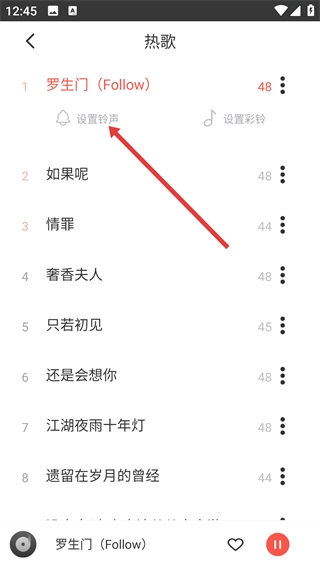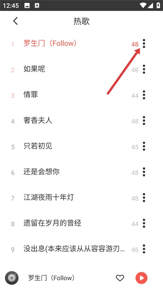 3、在热歌列表中,点击目标歌曲(如《罗生门(Follow)》)右侧的三点按钮,唤起对应的操作功能菜单。