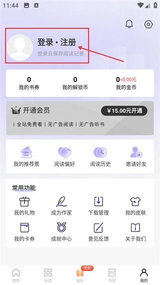 2、在个人中心页面点击【登录·注册】区域,进入登录界面,完成登录可同步云保存的阅读记录。