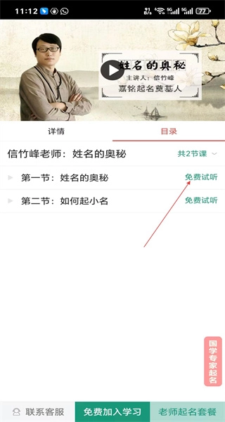 4、在课程目录页,查看各章节内容,选择第一节姓名的奥秘点击免费试听按钮开始学习。