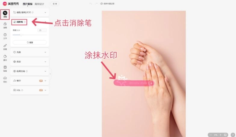 3、接着点击左侧工具栏中的“调整”选项,选择“消除笔”功能,根据需要调整画笔大小,用画笔涂抹想要去除的水印部分,这样就完成操作啦。