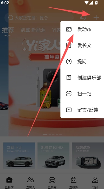 1、点击软件首页右上方的+号,在展开页面中点击发动态的功能选项。
