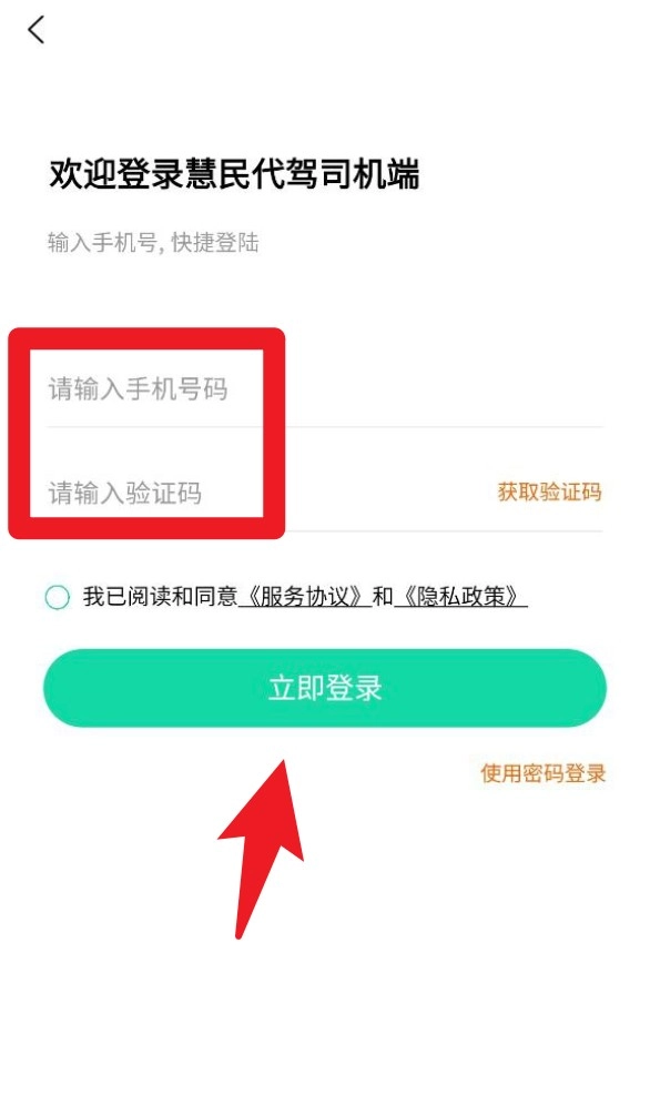 2. 已注册用户在登录界面输入手机号与验证码,勾选同意协议后点击绿色按钮立即登录。