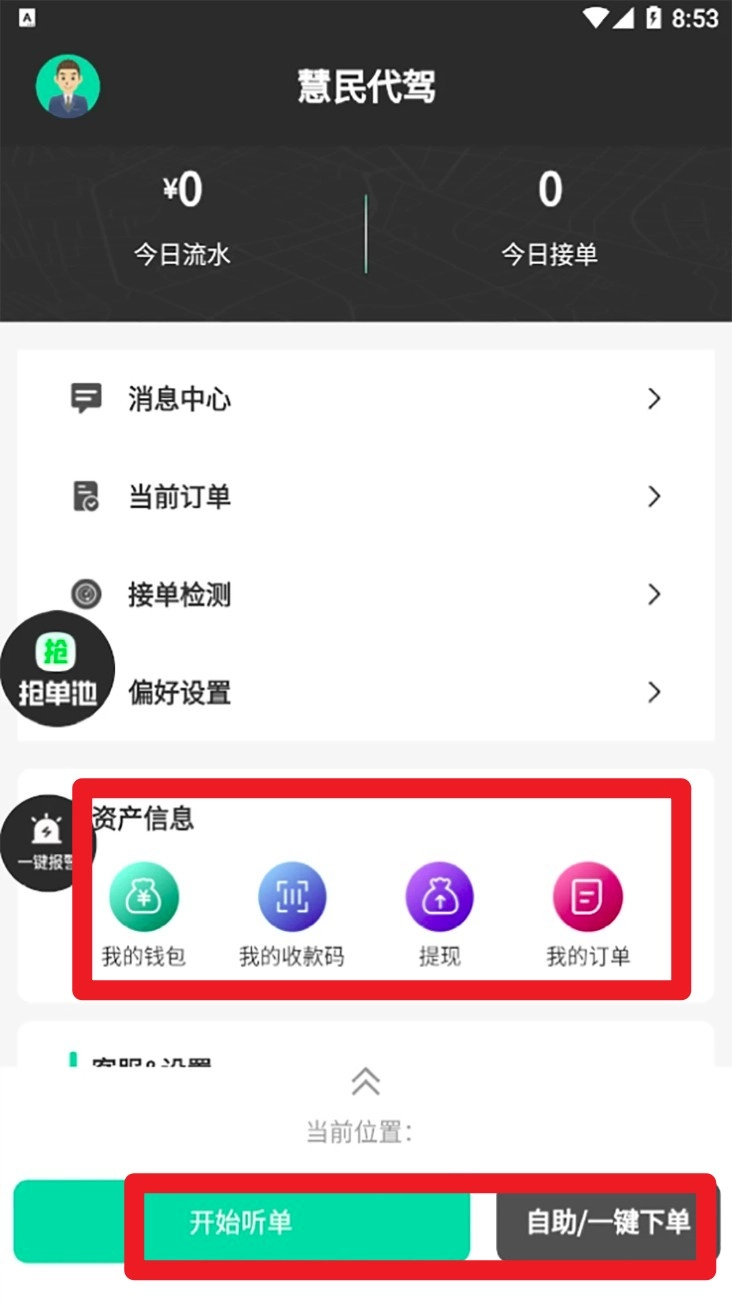 3. 登录成功后进入主界面,可查看今日流水与接单数,点击开始听单即可开启接单状态。