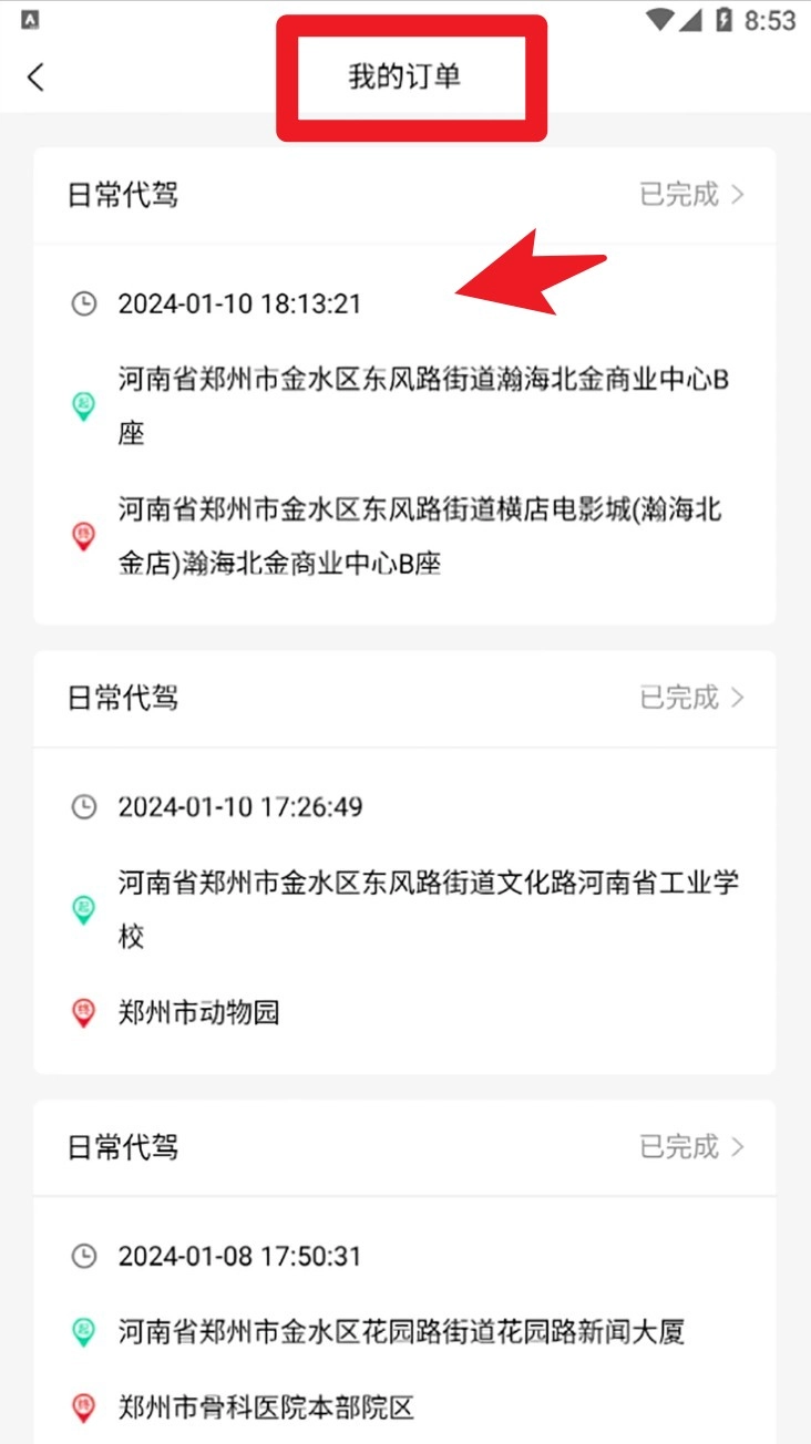 4. 点击我的订单进入订单管理页,可查看每一笔代驾任务的详细时间、地址与完成状态。