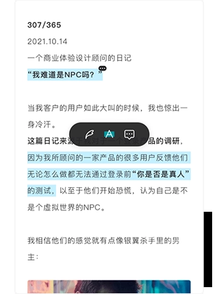 1、选中文章内容,可为其增加高亮标记,或者添加批注内容,还可以作为摘抄速记存储,便于日后整理。