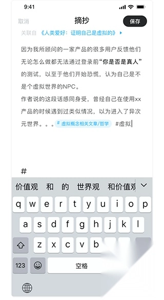 1、选中文章内容,点击摘抄按钮,即可生成摘抄内容,同时可以加入自己的想法和添加标签。同样支持点击或输入 # 添加标签,通过输入 “/” 来标记标签层级。