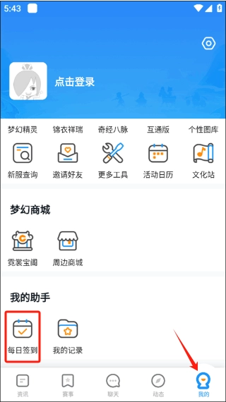 2、在“我的界面”中找到“我的助手”一栏,选择并点击“每日签到”的按钮选项。