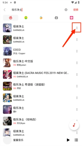 2、从搜索结果中选择您想要的歌曲版本,点击右侧的更多选项;