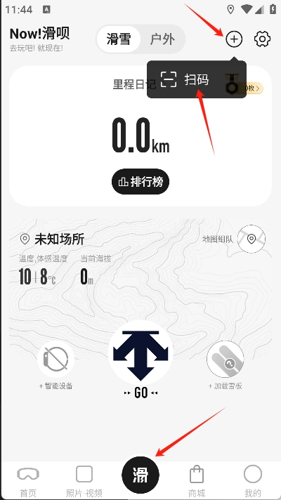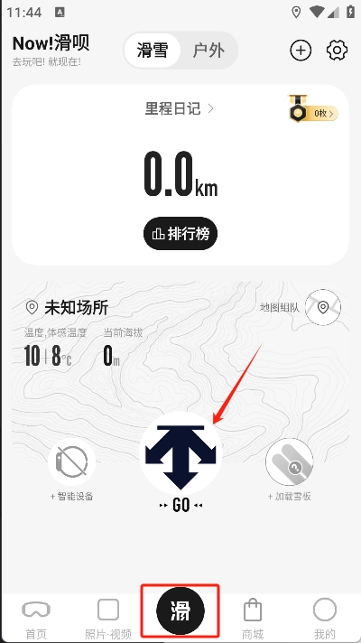 首先要打开滑呗应用,进入“GO”界面后点击“GO”按钮启动记录功能,此时可以根据实际情况选择室内滑雪模式或者室外滑雪模式。